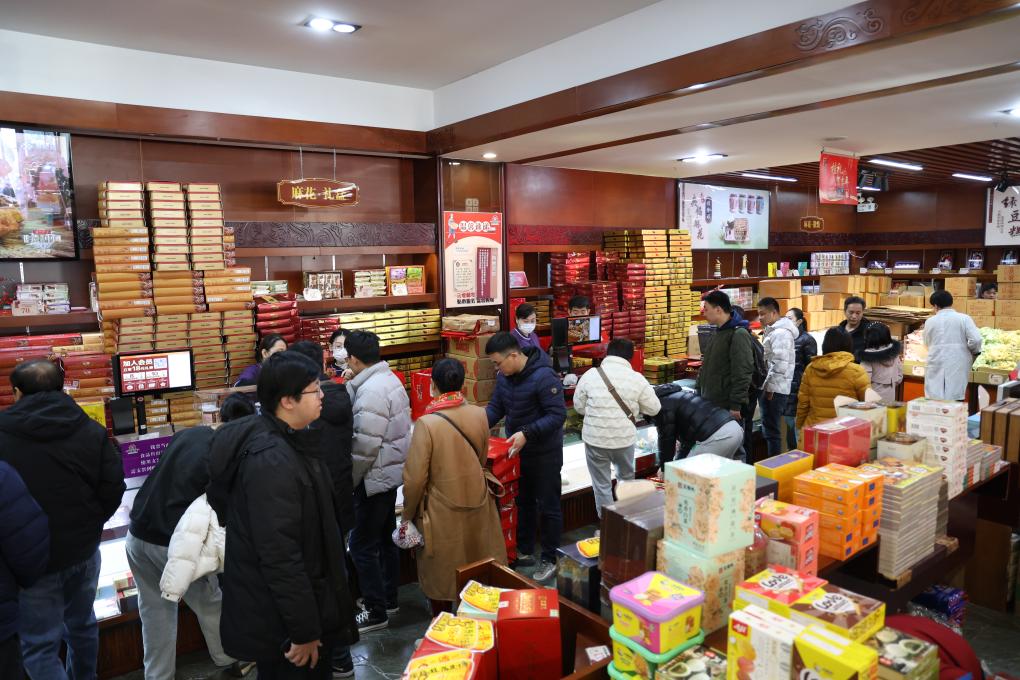 臨近除夕,天津桂發祥十八街麻花旗艦店內人頭攢動,以麻花為主的年貨商品包裝精美、琳瑯滿目,多個收銀&前叫單不斷、排起長隊。