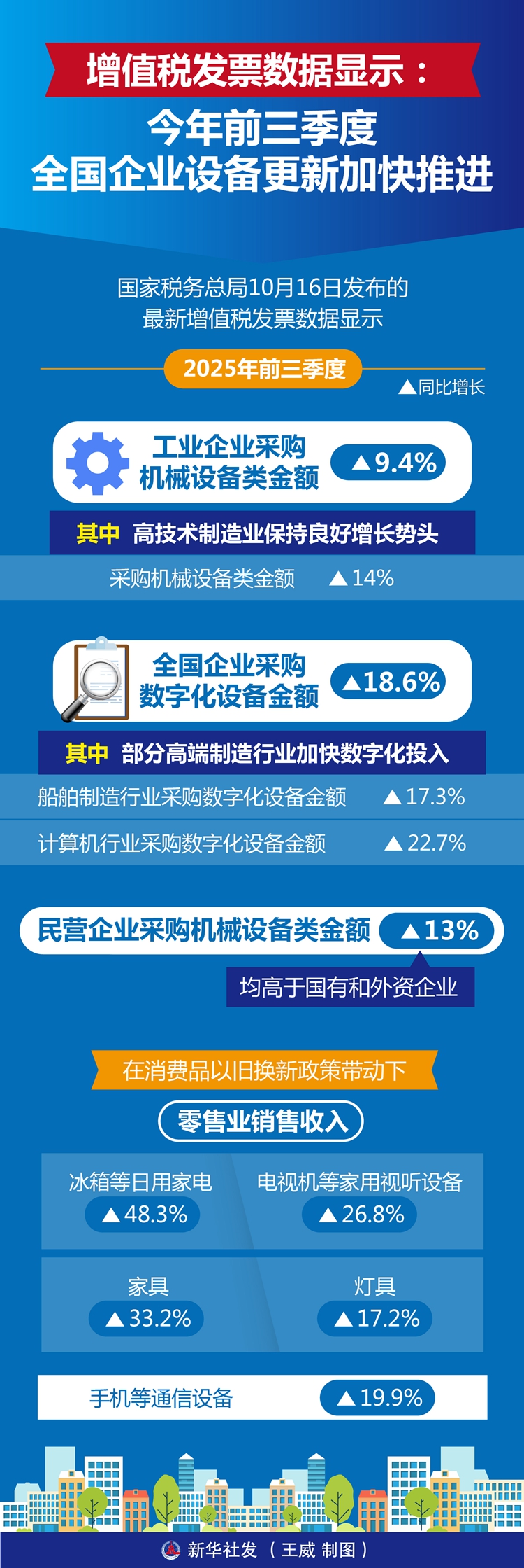 新華社北京10月16日電(記者劉開雄)國家稅務總局16日發布的最新增值稅發票數據顯示,隨着大規模設備更新和消費品以舊換新政策加力擴圍,今年前三季度,全國企業設備更新加快推進,消費品以舊換新政策成效明顯。