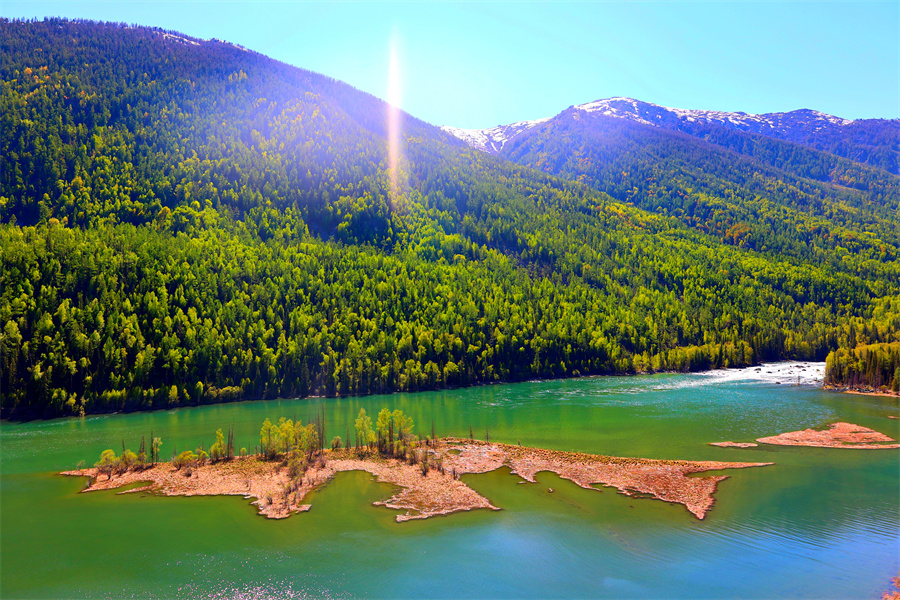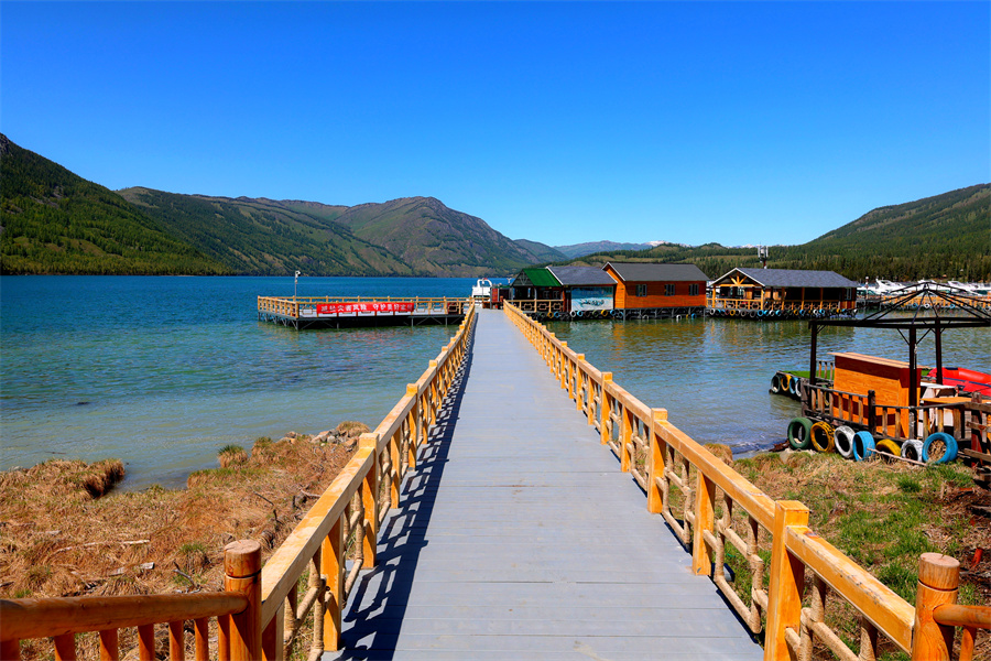 喀納斯湖位於新疆維吾爾自治區阿勒泰地區布爾津縣北部,因原始迷人的自然與人文景觀被譽為“人間凈土”。喀納斯湖四週群山環抱、層巒疊嶂,森林密布、草場繁茂,山坡一片蔥綠,湖面碧波蕩漾,群山倒映湖中,藍天、白雲、雪嶺、青山與綠水渾然一體,湖光山色美不勝收。(石曉坤)