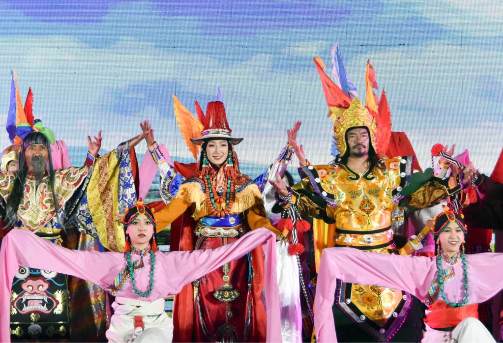 7月13日晚,新疆克州第九屆瑪納斯國際文化旅游節上,歌舞演員表演藏族英雄史詩《格薩(斯)爾》。新華社記者 張瑜 攝
