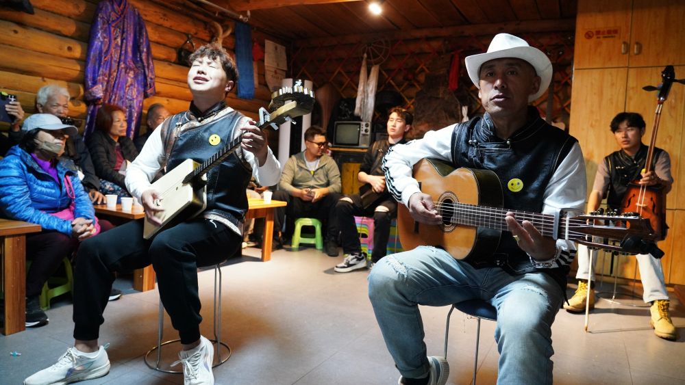 6月2日,在新疆喀納斯景區家訪點,樂隊歌手為游客演唱。新華社記者 阿曼 攝