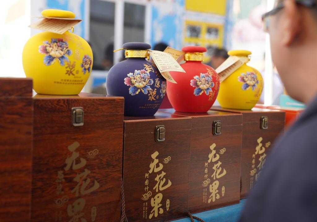 9月24日,在阿圖什市上阿圖什鎮塔庫提村設施農業基地,一位參觀者在觀看無花果釀造的白酒。 新華社記者 趙宇思 攝