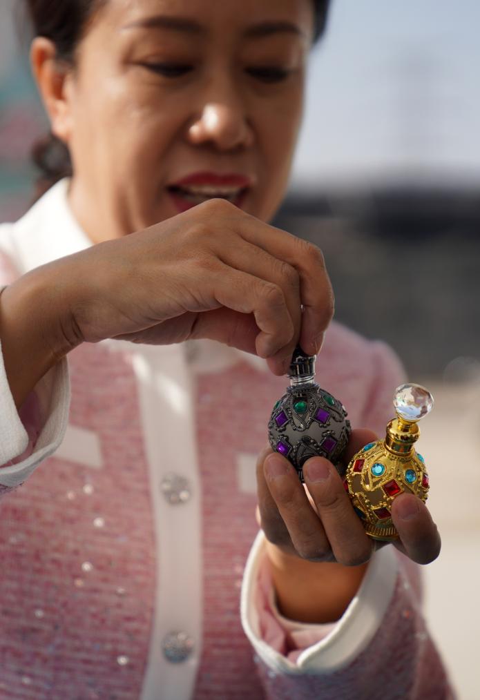 9月24日,在阿圖什市上阿圖什鎮塔庫提村設施農業基地,一位工作人員在展示以無花果為原料製造的香水。新華社記者 趙宇思 攝