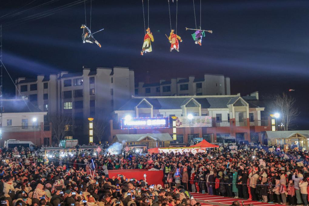 春節假期,在新疆巴音郭楞蒙古自治州博湖縣,一場主題為“西游西海·穿越博湖”的高空威亞特技飛天音樂節精彩上演。特技演員身着華麗的服飾,在高空中自由穿梭、翩翩起舞,非遺傳承人以靈動的舞姿展現濃郁的民族風情,絢麗的煙花在夜空中綻放,精彩紛呈的活動為春節增添了歡樂的節日氛圍,同時吸引各地游客前來觀賞。(年磊)