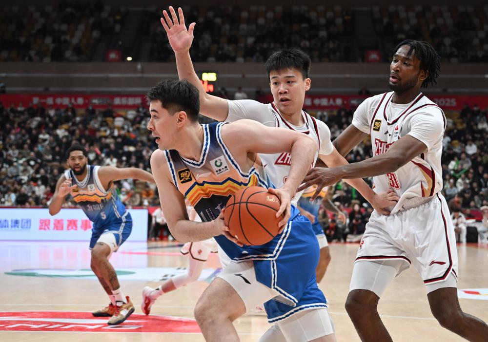2月9日,浙江稠州金租隊球員王奕博(中)在比賽中進攻。新華社記者 張博文 攝