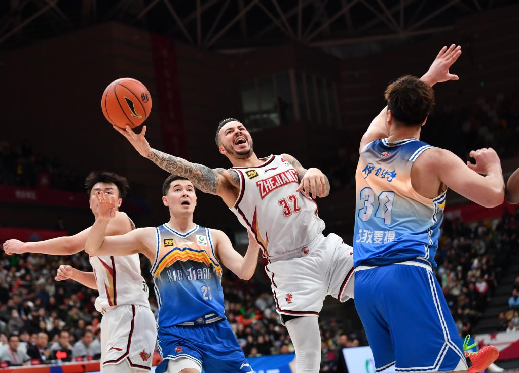 2月9日,浙江稠州金租隊球員約克(右二)在比賽中上籃。新華社記者 張博文 攝