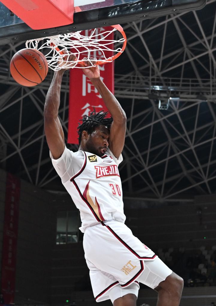2月9日,浙江稠州金租隊球員琼斯在比賽中扣籃。新華社記者 張博文 攝