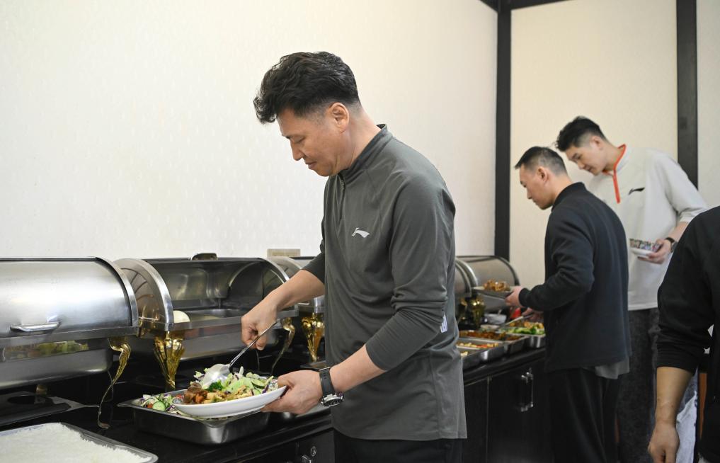 姜正秀在位於烏魯木齊的訓練基地吃午飯(2025年2月25日攝)。