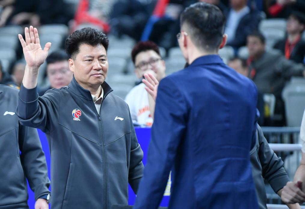 姜正秀(左)賽前新疆伊力特隊主教練劉煒擊掌加油(2025年3月12日攝)。