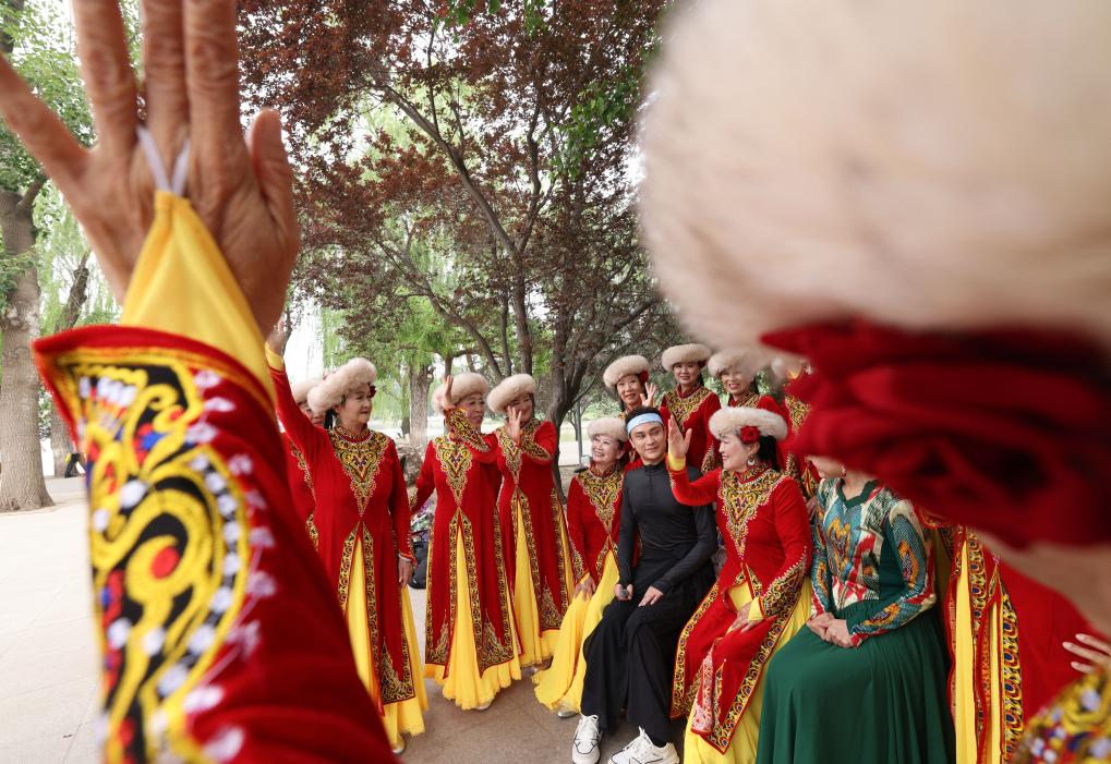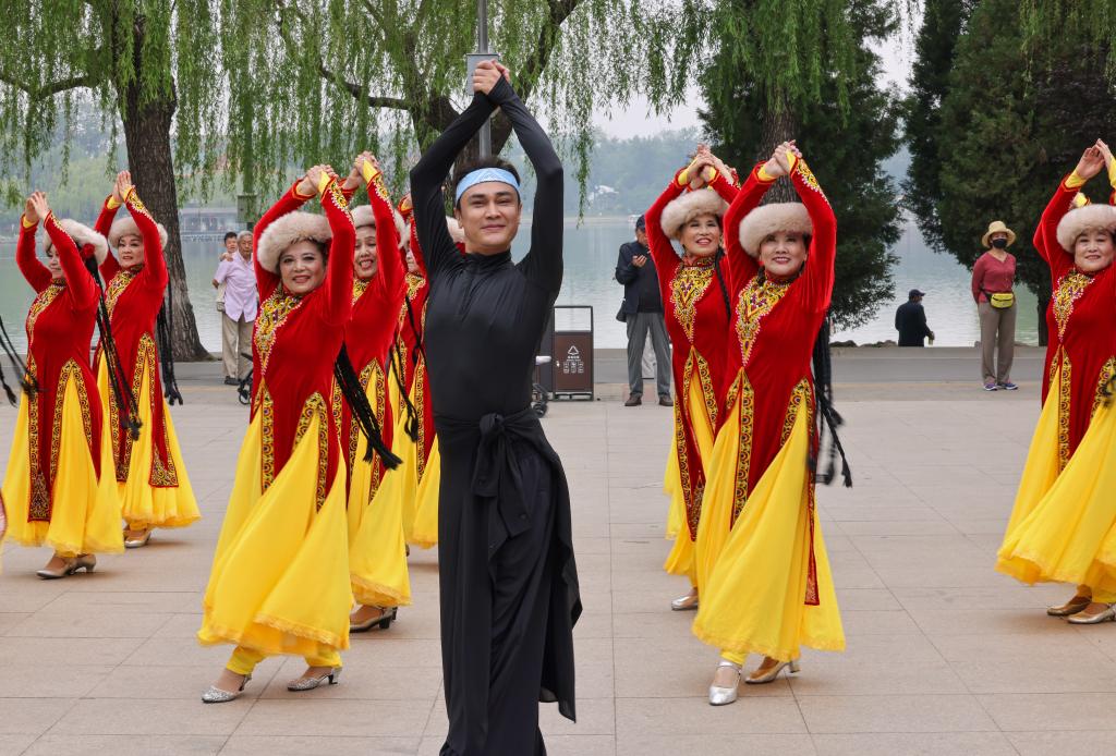 5月24日,熱合木土拉·阿馬努拉在北京龍潭公園教授新疆民族舞蹈。 原新疆藝術劇院歌舞團青年舞蹈編導熱合木土拉·阿馬努拉,畢業於北京舞蹈學院編導係,原創作品多次獲得國內外舞蹈獎項。2020年,他開始從專業舞&走進公園和廣場的教學課堂,向業餘愛好者教授新疆民族舞蹈。他先後在北京、上海、成都、武漢、西安和三亞等地授課,已累計培訓6000余名業餘舞蹈愛好者,年齡最大的87歲,最小的只有7歲。