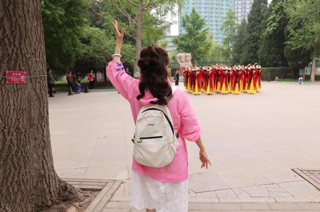 5月24日,在北京龍潭公園,一位游客模仿着新疆民族舞蹈的動作跳起舞來。 記者:殷剛、才揚