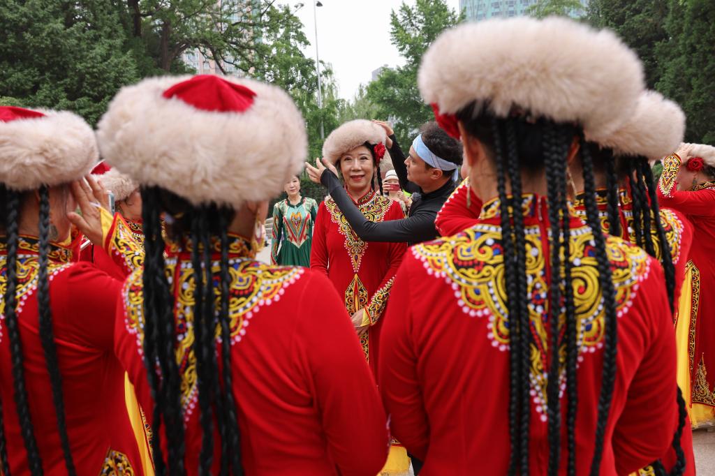 5月24日,在北京龍潭公園,熱合木土拉·阿馬努拉給舞蹈愛好者講解如何展現新疆民族服飾效果。