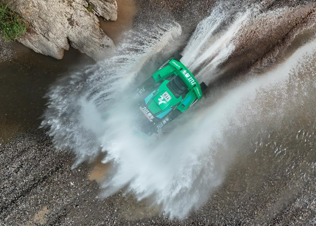 5月23日,河北遷安九江汽摩運動俱樂部車手趙玉喬、領航員桂海波駕駛賽車在比賽中(無人機照片)。當日,2025中國環塔國際拉力賽第三賽段比賽在新疆阿克蘇地區柯坪縣進行。該賽段長330多公里,以狹窄涉水峽谷、戈壁等地形地貌為主。 新華社記者 胡虎虎 攝