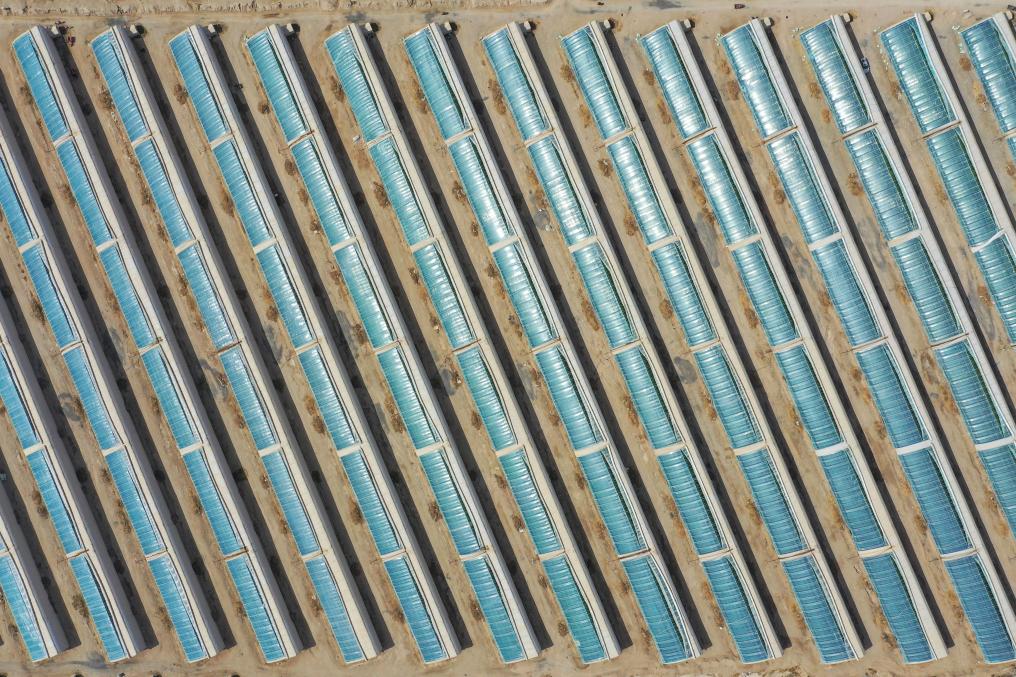 這是2024年3月24日拍攝的新疆阿克蘇市阿依庫勒鎮蔬菜基地一角(無人機照片)。春耕時節,在位於塔克拉瑪幹沙漠邊緣的阿克蘇市阿依庫勒鎮蔬菜基地,種植戶在一座座現代化溫室大棚裏忙碌。在現代農業科技加持下,該基地已成為南疆地區的重要蔬菜産地,一年四季出産十余種新鮮蔬菜行銷天山南北。新華社記者 丁磊 攝
