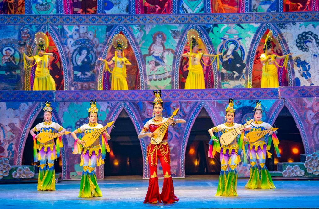 在新疆阿克蘇文化藝術中心,演員在文旅演藝秀《千年之約 夢幻龜茲》第一幕“弦鼓一聲龜茲韻”中演出(2020年10月17日攝)。新華社記者 胡虎虎 攝