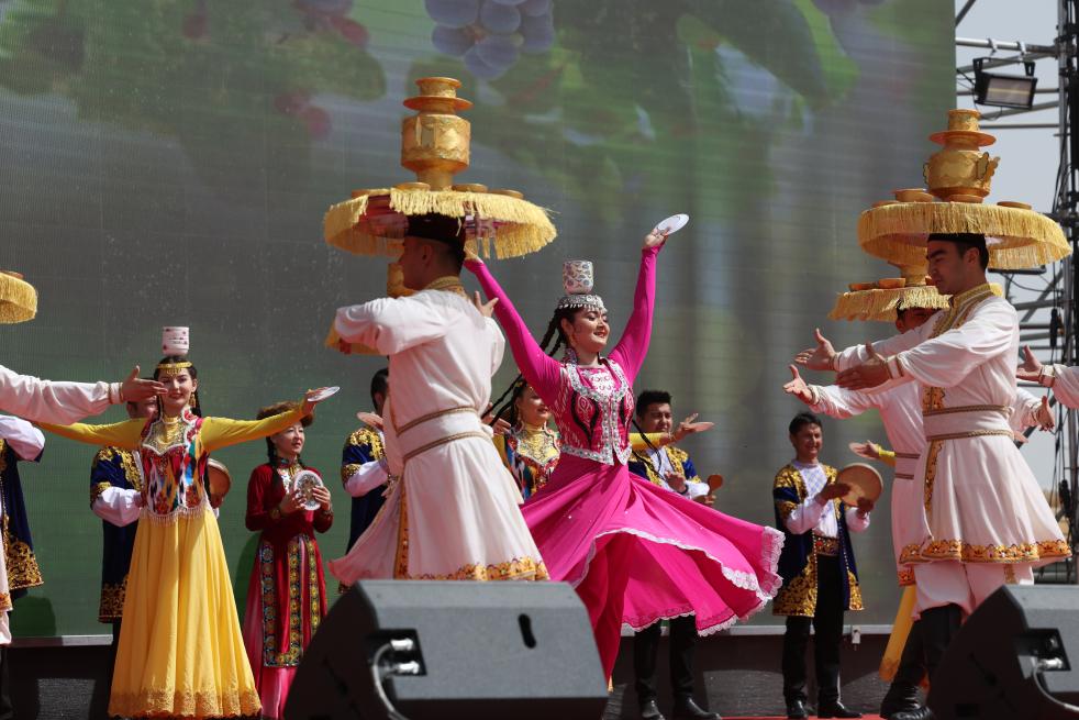 2023年5月18日,大型文藝演出《阿克蘇之約》在新疆阿克蘇影劇院上演,歡迎環塔參賽人員以及各地游客。新華社記者 胡虎虎 攝