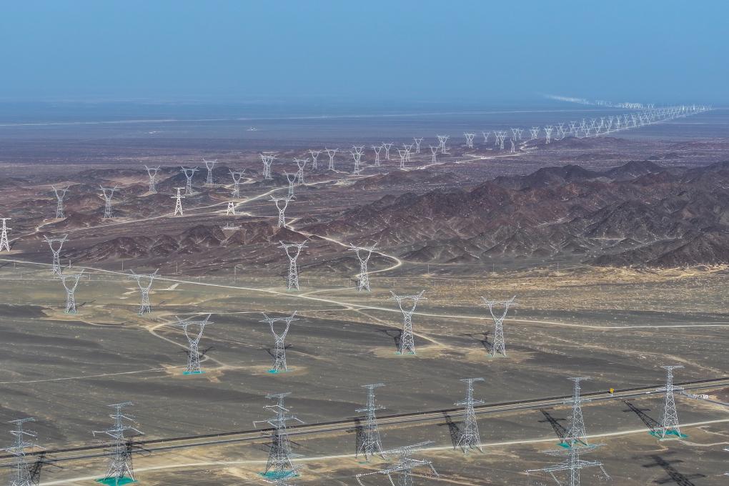 這是5月29日在甘肅省武威市拍攝的哈密至重慶±800千伏特高壓直流輸電工程(無人機照片)。