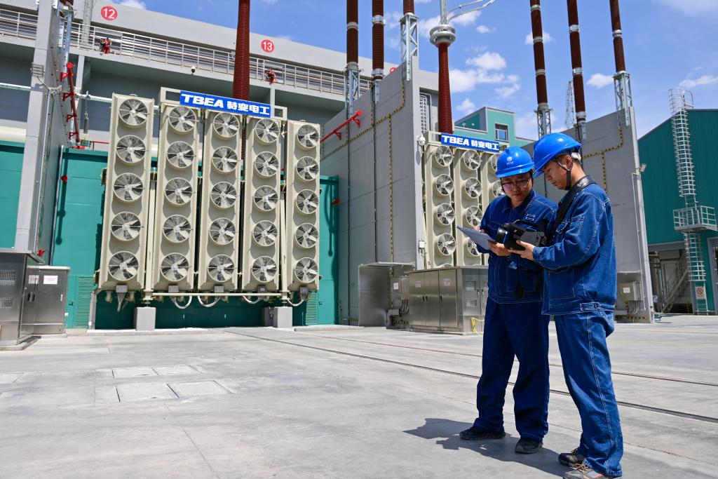 6月10日,在哈密—重慶±800千伏特高壓直流輸電工程新疆送端站——巴裏坤換流站,運檢人員進行避雷器巡視檢查。新華社記者 丁磊 攝