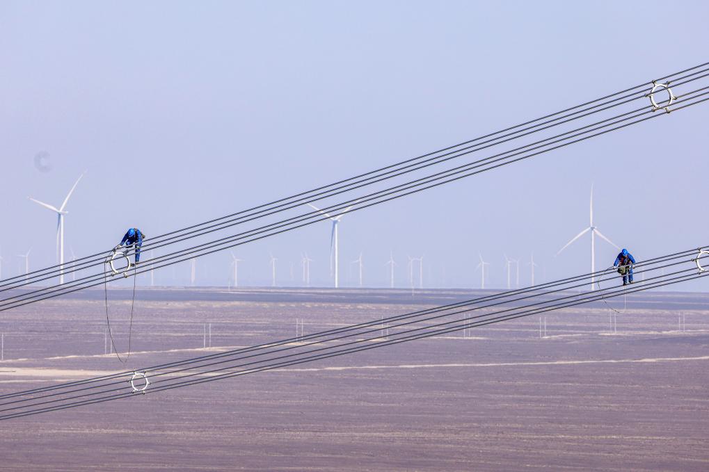 在新疆哈密市,電力員工對哈密—重慶±800千伏特高壓直流輸電工程進行走線檢查(4月8日攝,無人機照片)。