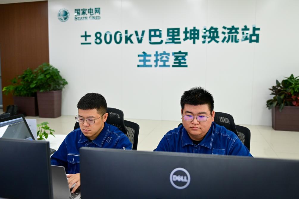 在哈密—重慶±800千伏特高壓直流輸電工程新疆送端站——巴裏坤換流站,運檢人員在主控室監看運行數據(6月10日攝)。