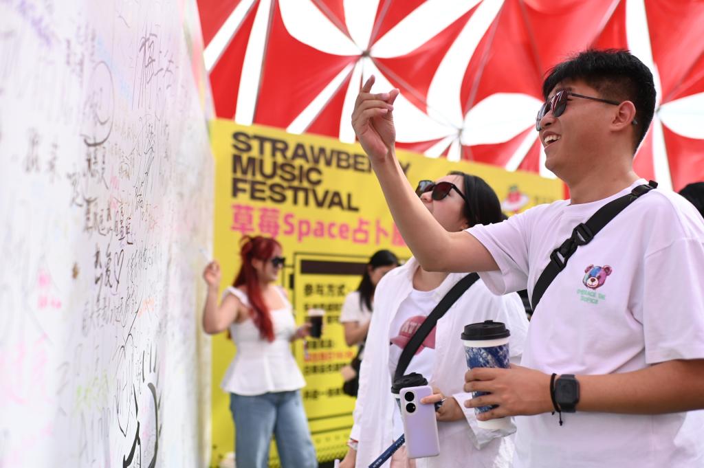 7月12日,在2025新疆超級草莓音樂節現場,人們參加簽名墻活動。新華社 發(徐銳 攝)