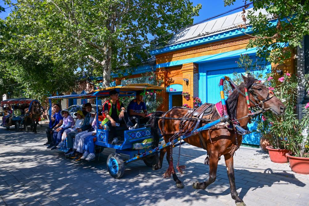 2025年7月24日,游客在新疆伊犁哈薩克自治州伊寧市伊犁老城喀讚其文化旅游區乘坐馬車觀光游覽。丁磊 攝