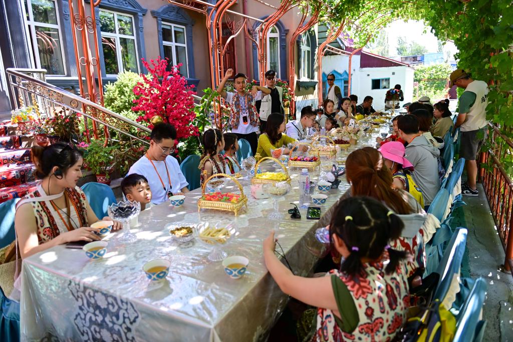 2025年7月24日,游客在新疆伊犁哈薩克自治州伊寧市伊犁老城喀讚其文化旅游區家訪點品嘗當地美食。丁磊 攝
