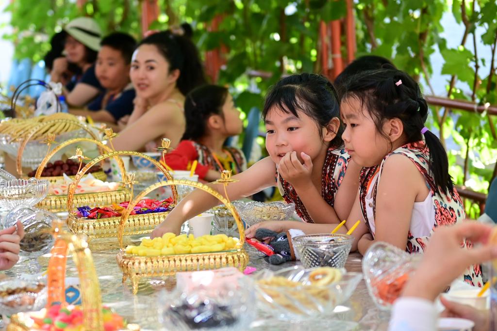 2025年7月24日,研學游的小朋友在新疆伊犁哈薩克自治州伊寧市伊犁老城喀讚其文化旅游區學做當地特色糕點。丁磊 攝