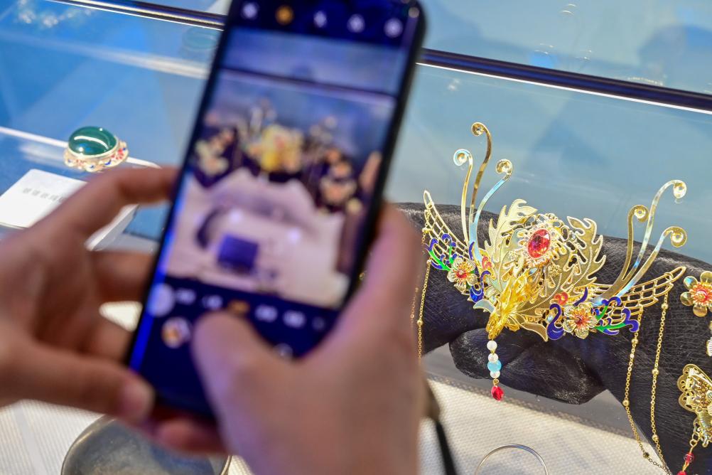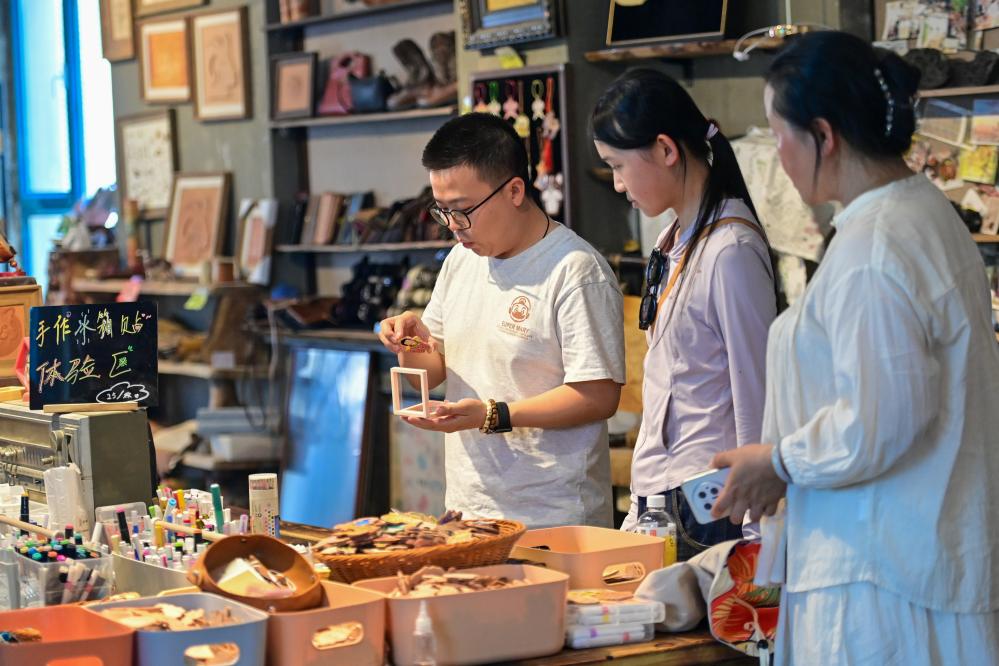 2025年7月24日,游客在新疆伊犁哈薩克自治州伊寧市伊犁老城喀讚其文化旅游區傳統技藝展示區挑選商品。丁磊 攝
