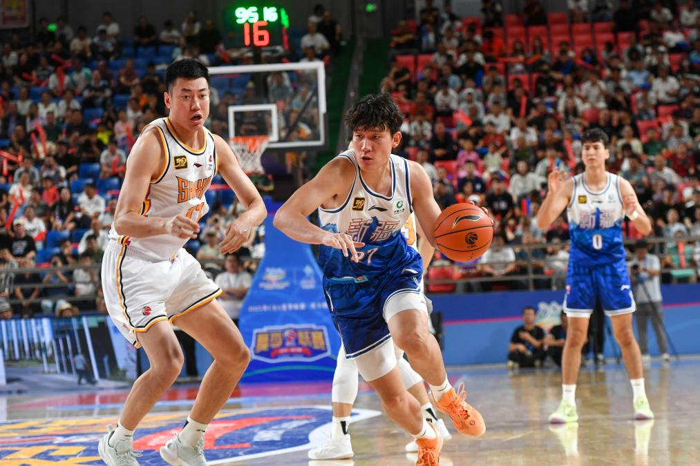 8月15日,新疆伊力特隊球員葛浩然(左一)在比賽中持球進攻。新華社記者 高晗 攝