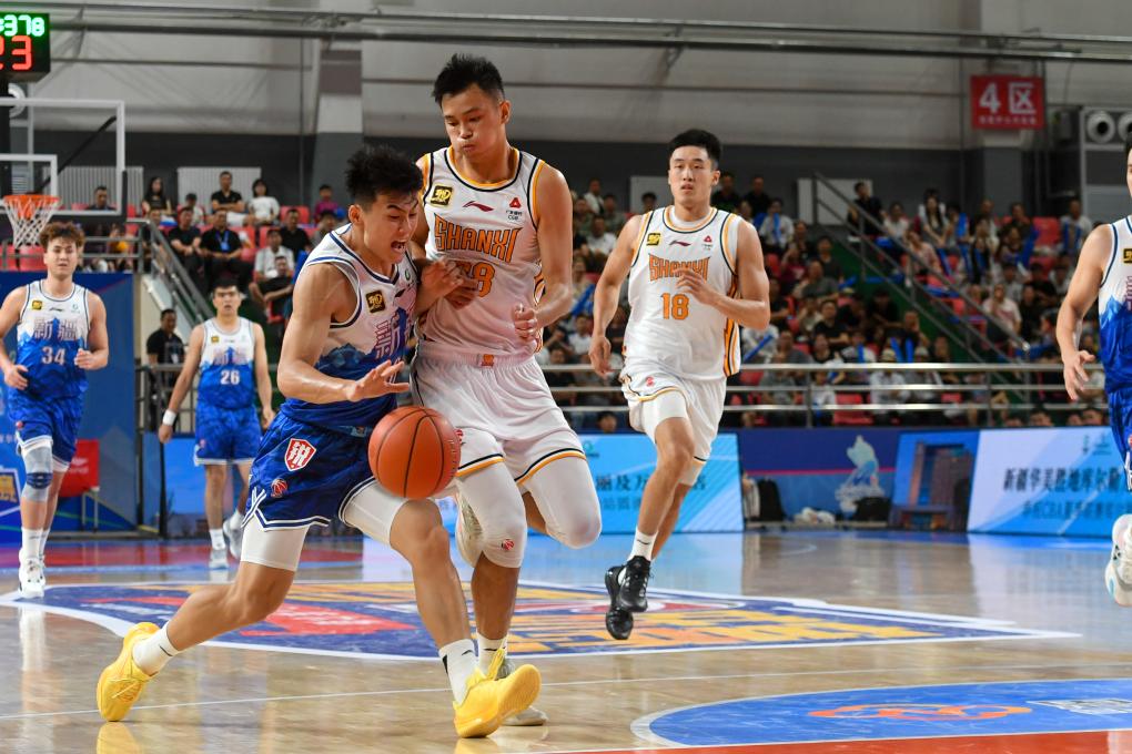 8月15日,山西汾酒隊球員劉傳興(左)在比賽中持球進攻。新華社記者 高晗 攝