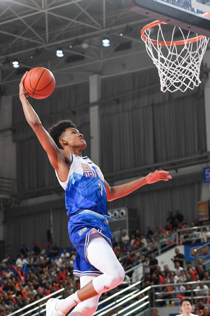 8月15日,新疆伊力特隊球員馮傲在比賽中扣籃。新華社記者 高晗 攝