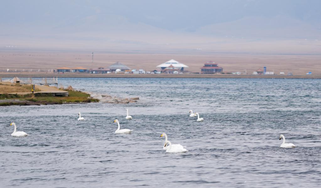 9月10日,天鵝在賽裏木湖游弋。新華社記者 張浩波 攝