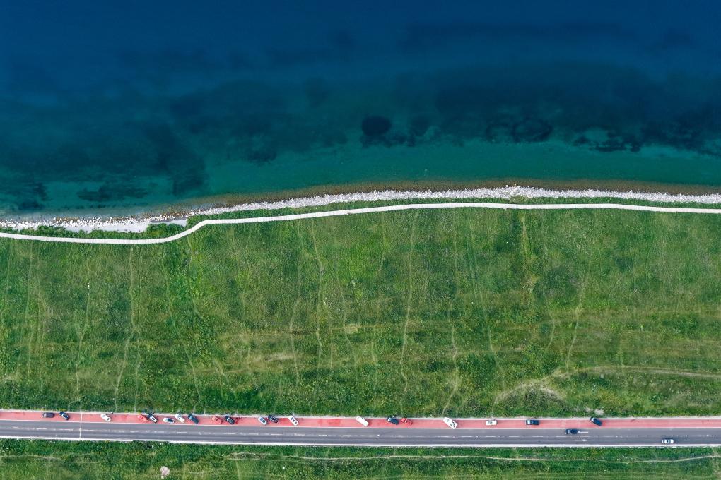 游客駕車行駛在賽裏木湖景區(無人機照片,7月8日攝)。新華社記者 辛悅衛 攝