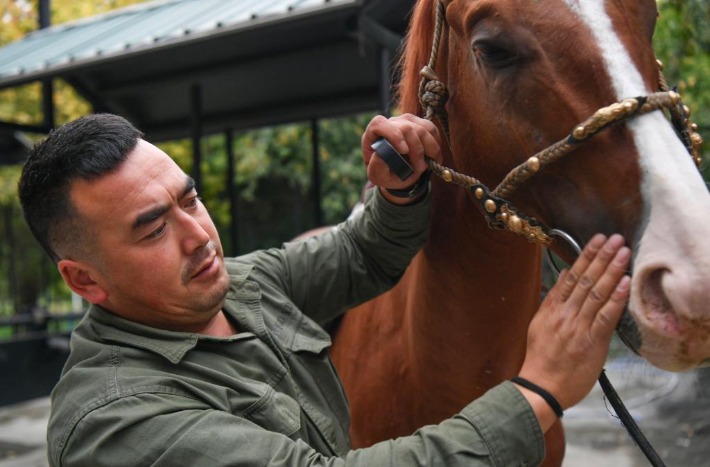 9月9日,在新疆烏魯木齊汗血馬基地,希爾扎提在備馬。新華社記者 王菲 攝