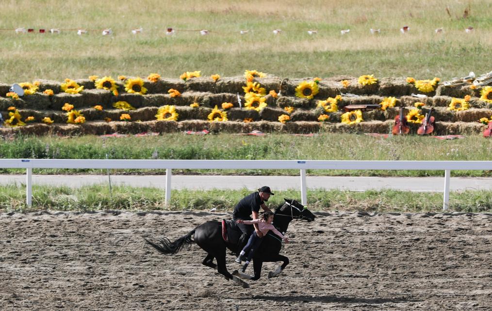 在新疆烏魯木齊汗血馬基地,希爾扎提和女兒夏克拉一起在為游客表演(7月23日攝)。新華社記者 耿馨寧 攝