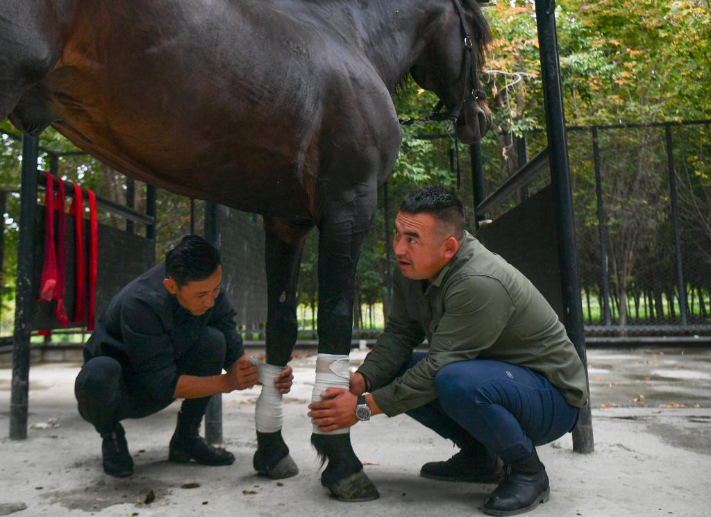 9月9日,在新疆烏魯木齊汗血馬基地,希爾扎提(右)與馬隊隊友一起備馬。新華社記者 王菲 攝