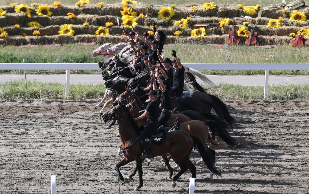 在新疆烏魯木齊汗血馬基地,希爾扎提(中)與馬隊隊友一起為游客表演(7月23日攝)。新華社記者 耿馨寧 攝