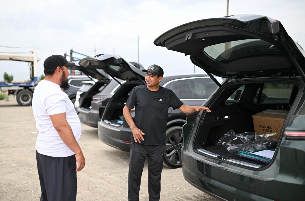 5月23日,在哈薩克斯坦扎爾肯特鎮的中轉停車場,運輸公司工作人員在查看進口自中國的汽車。新華社記者 李任滋 攝