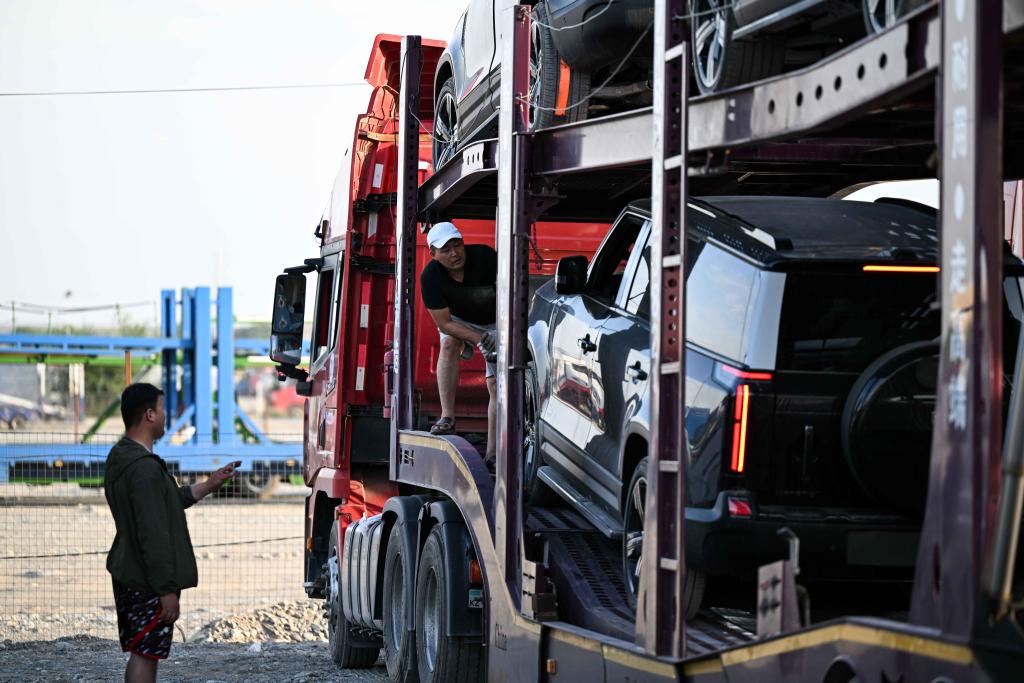 5月23日,在哈薩克斯坦扎爾肯特鎮的中轉停車場,運輸公司工作人員裝載進口自中國的汽車。車輛將被運往哈薩克斯坦各大城市、中亞其他國家、俄羅斯等目的地。新華社記者 李任滋 攝