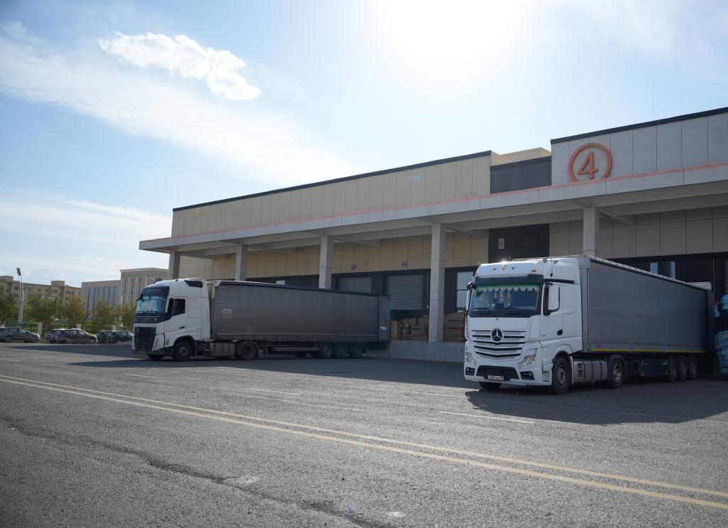 9月11日,在新疆阿拉山口跨境電商産業園,兩輛來自哈薩克斯坦的貨車在等待裝貨。