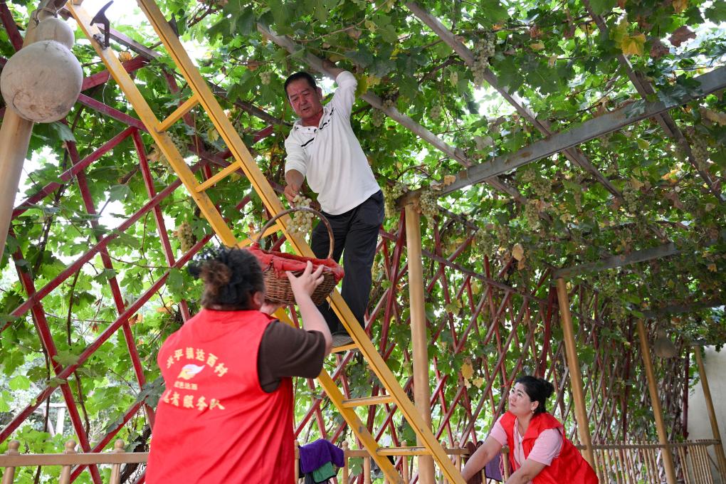 9月18日,達西村村幹部入戶幫助村民採摘葡萄。新華社記者 辛悅衛 攝