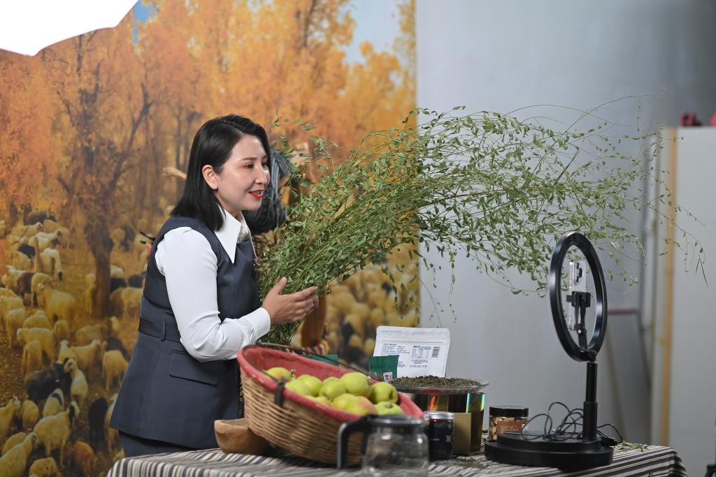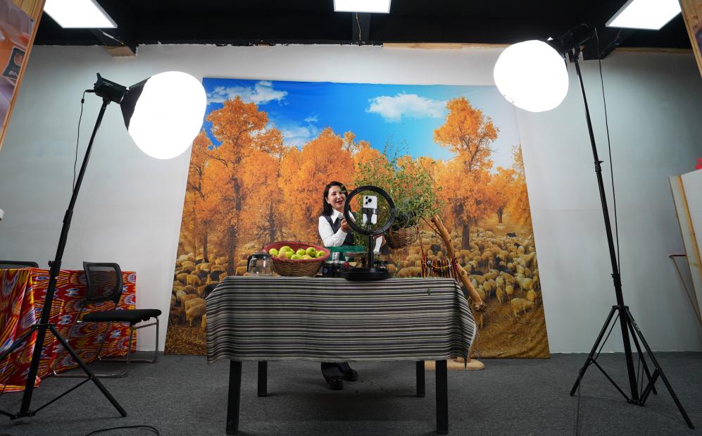 9月19日,尉犁縣電商協會負責人米日阿依·阿西木在達西村的電商基地直播推介達西村農産品。新華社記者 盧燁 攝