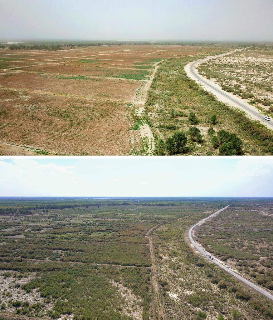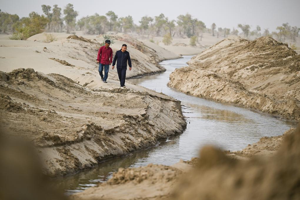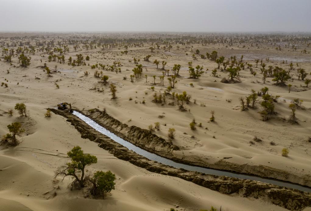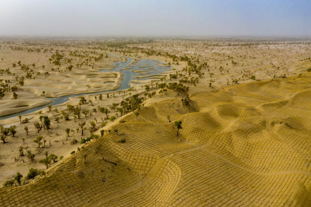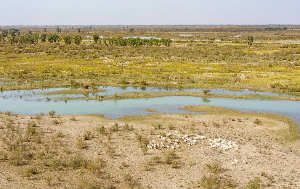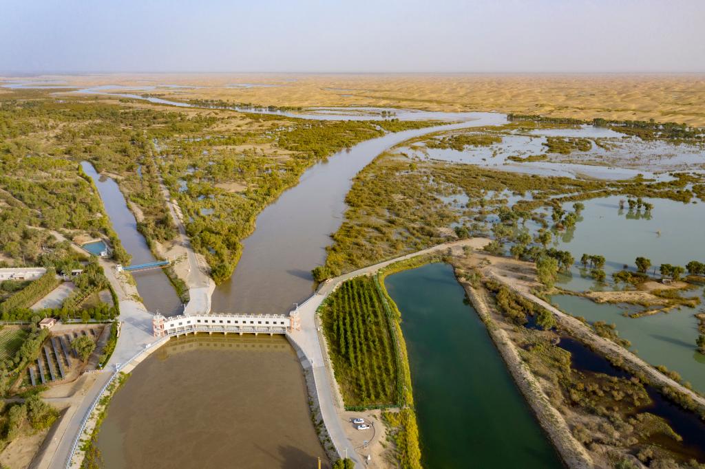 塔裏木河沿塔克拉瑪幹沙漠北緣蜿蜒