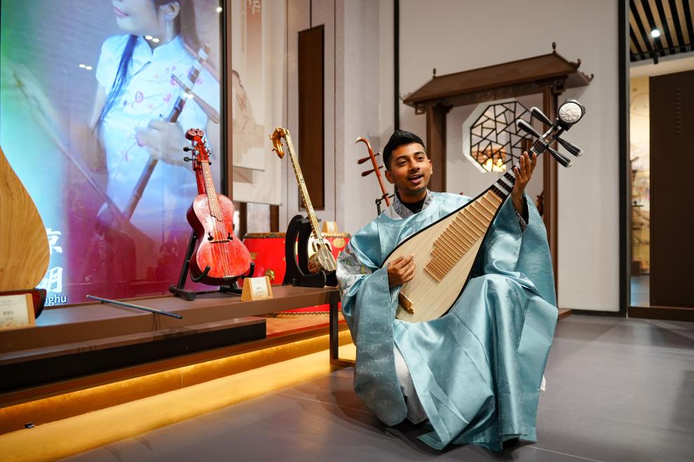 11月28日,在新疆中哈霍爾果斯國際邊境合作中心中國文化館,參加活動的青年穿着中國傳統服飾體驗琵琶彈唱。新華社記者 徐宏岩 攝