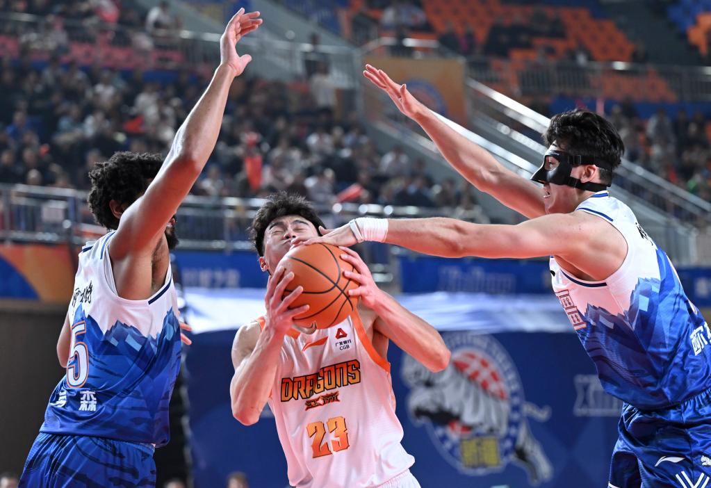 1月11日,新疆伊力特隊球員西爾扎提(右)與隊友勞森(左)防守江蘇肯帝亞隊球員閆實的進攻。新華社發(徐銳 攝)