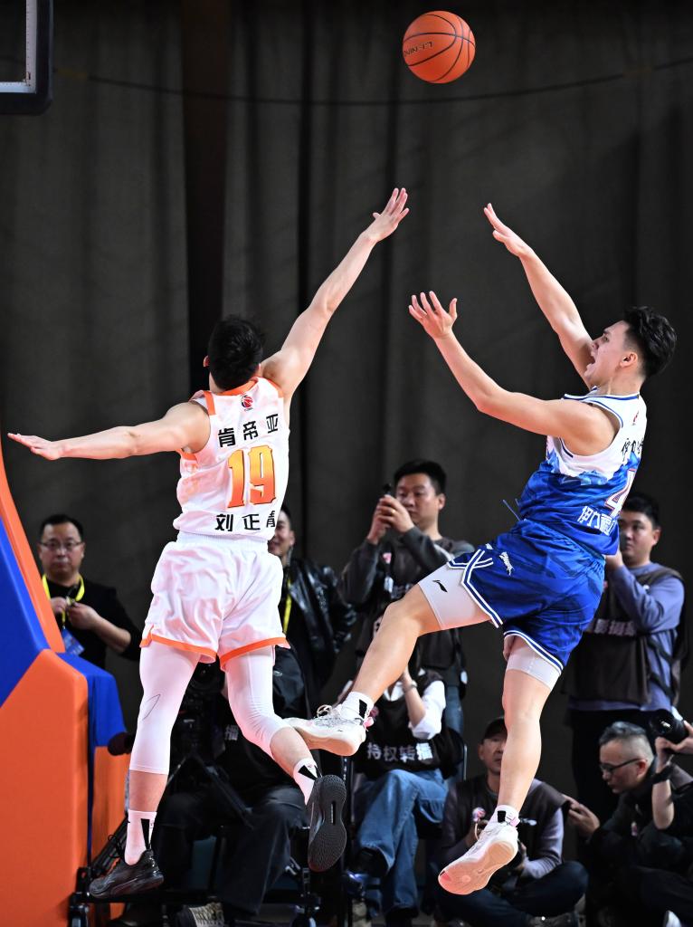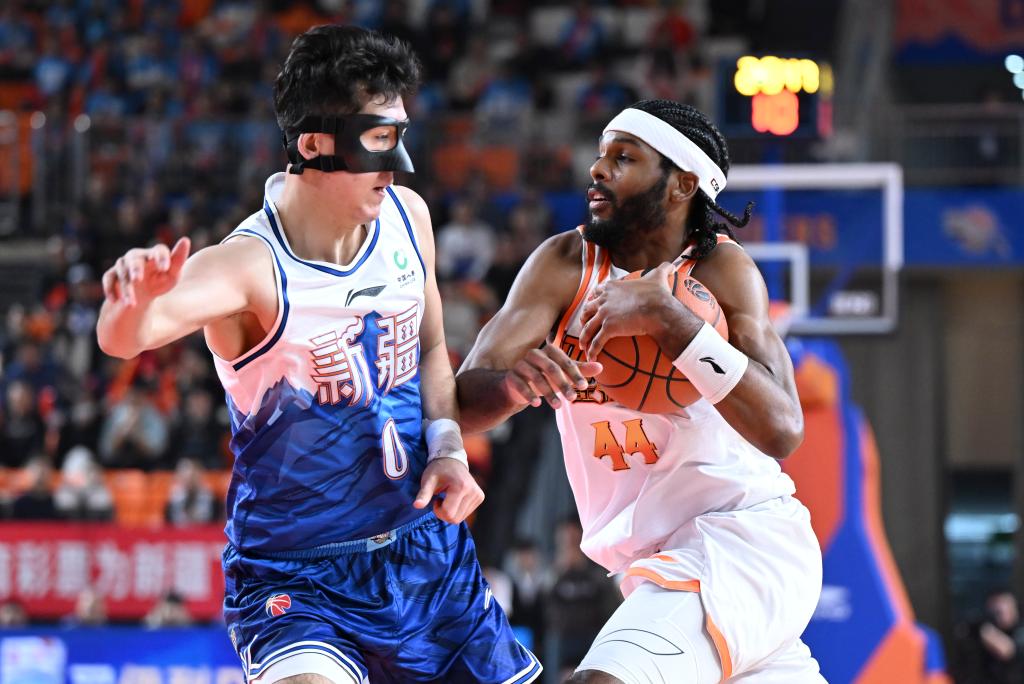 1月11日,新疆伊力特隊球員伊力福拉提(右)在比賽中進攻。新華社發(徐銳 攝)