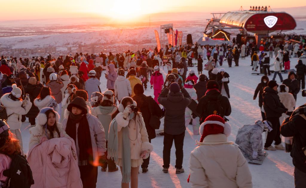 1月18日,日落時分,游客在新疆阿勒泰將軍山國際滑雪度假區游玩。新華社發(葉爾江·木哈買提 攝)