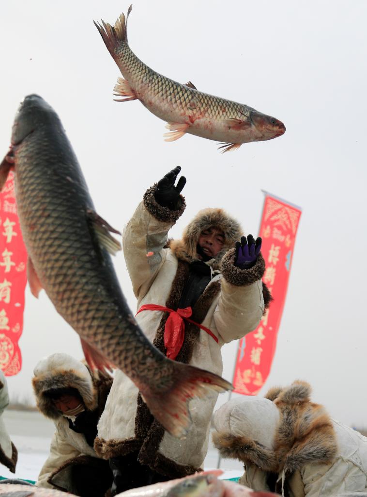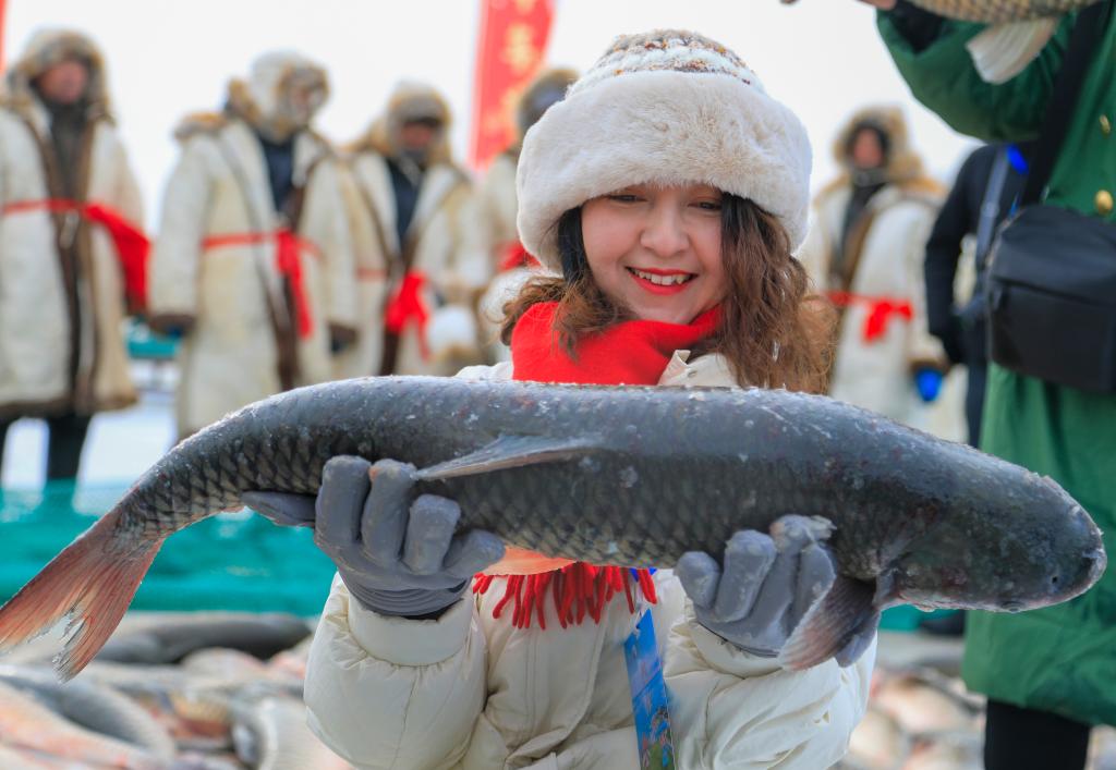 1月18日,在博斯騰湖冰面上,游客手捧剛打撈上來的博斯騰湖魚。