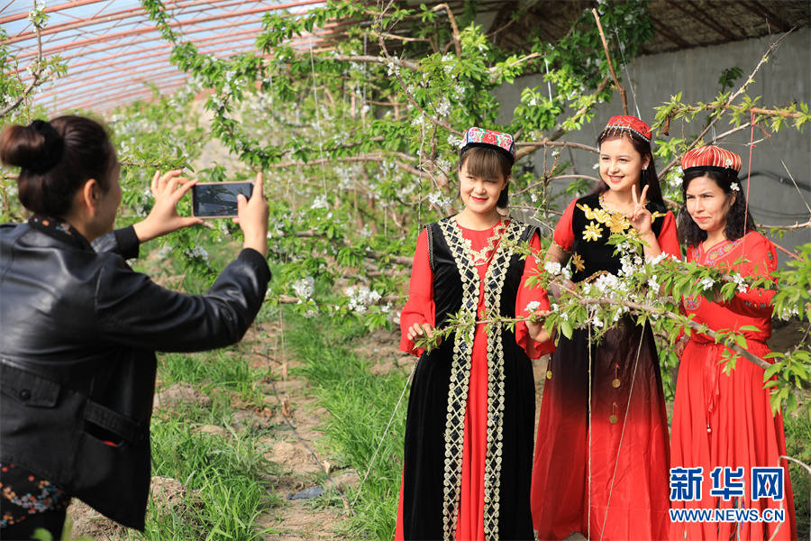 游客開迪婭·吐地和兩位好友身穿艾德萊斯綢花裙在櫻桃樹前合影,留住美麗瞬間。